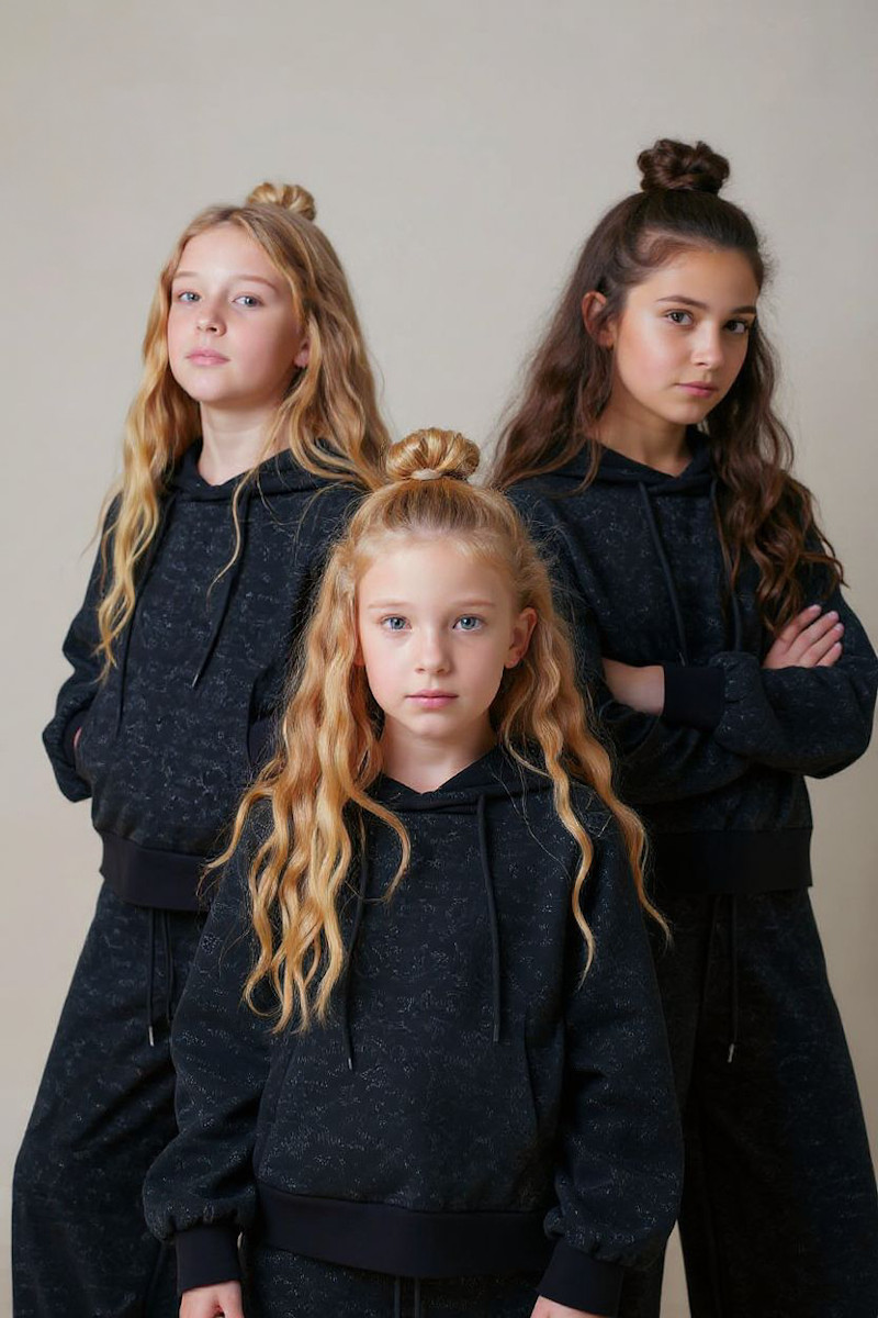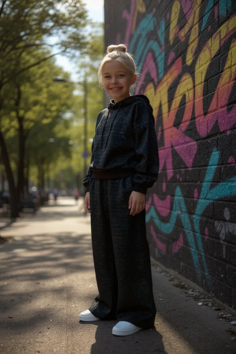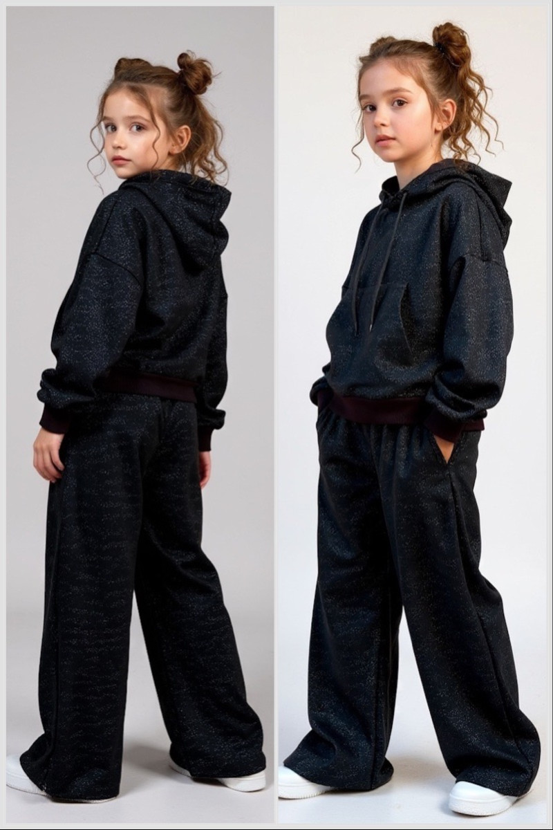 Komplet dresowy dla dziewczynki w rozmiarach 140–164, miękki, komfortowy zestaw składający się z bluzy z kapturem i luźnych spodni o szerokich nogawkach. Bluza ma praktyczny kaptur z troczkami i ściągacz w pasie, spodnie posiadają wygodną gumkę w talii i kieszenie boczne. Kolor czarny z delikatną srebrną poświatą sprawia, że komplet jest uniwersalny a także wyjątkowy.