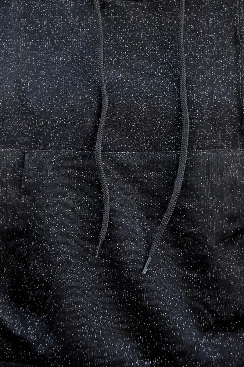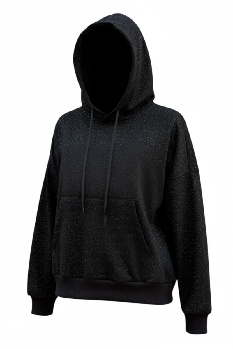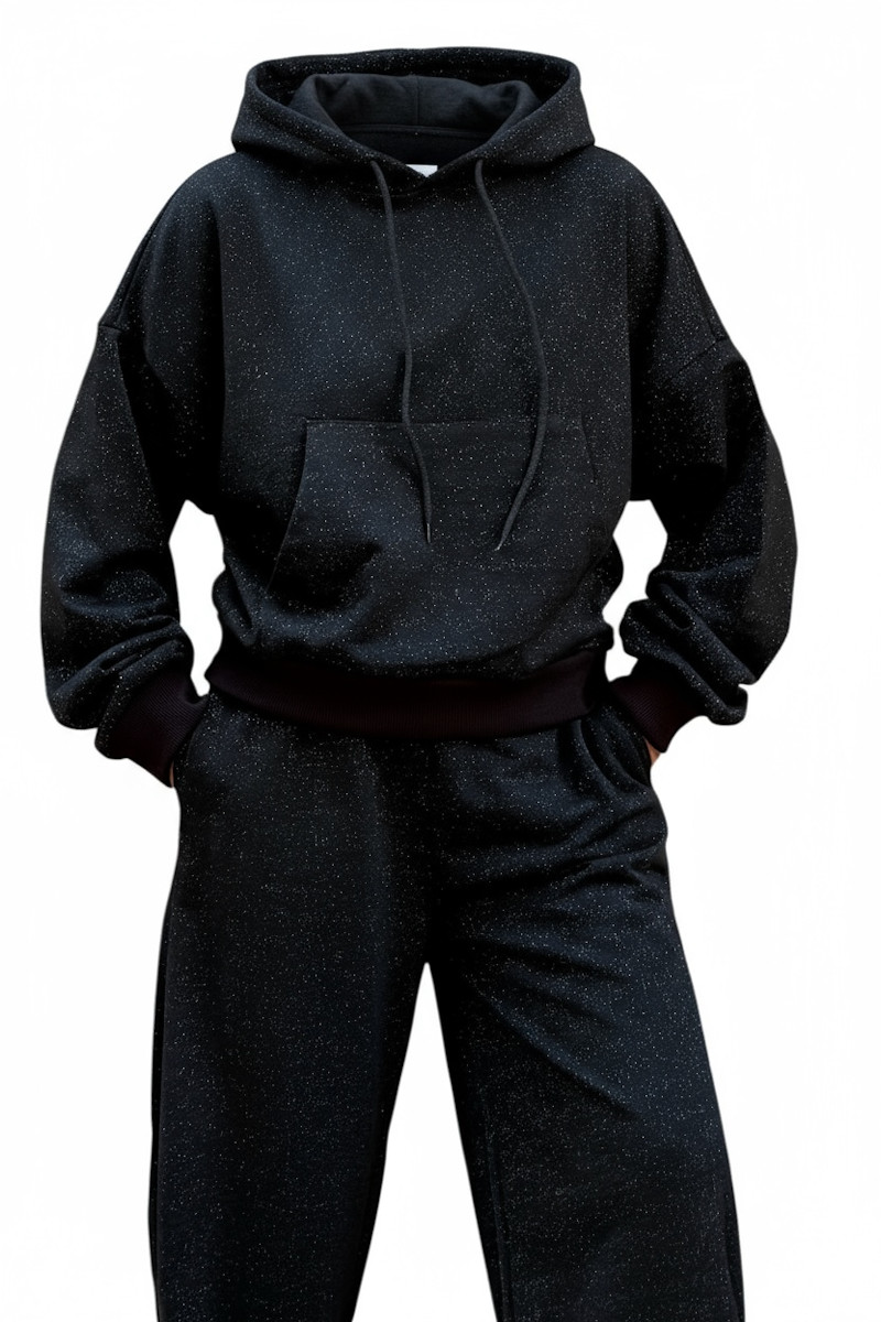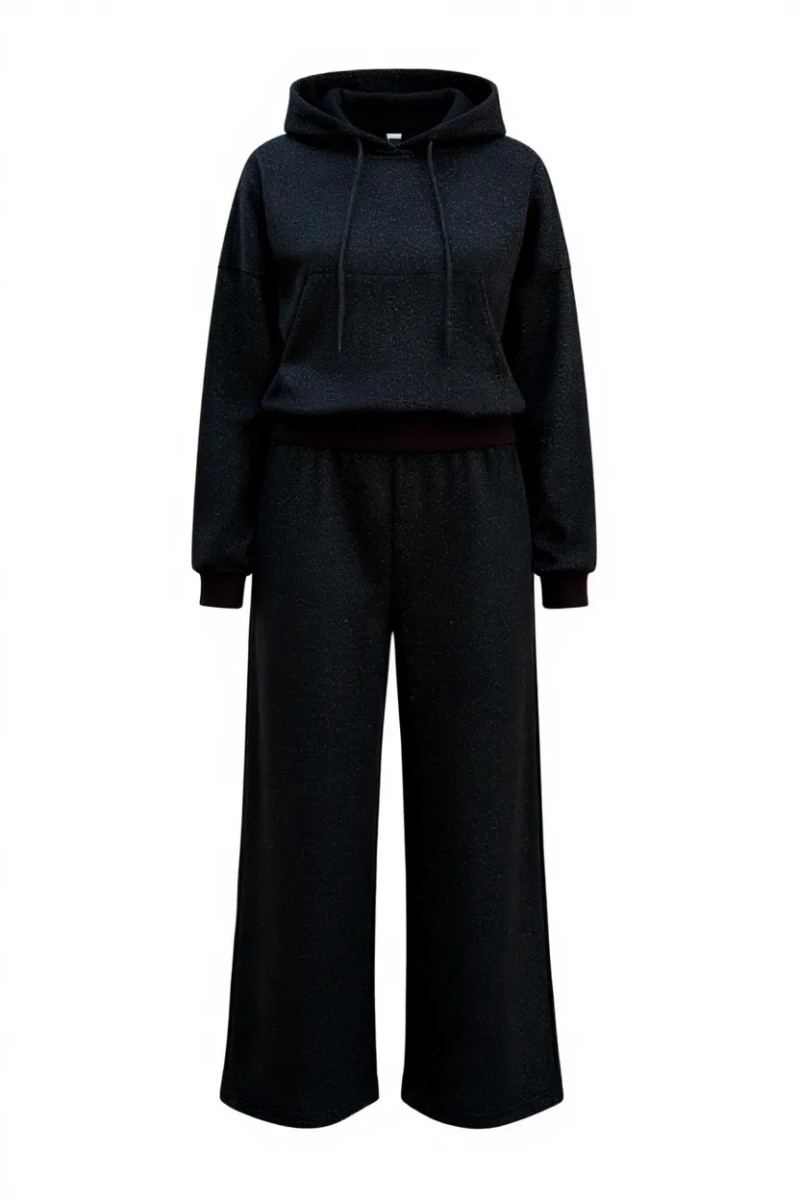 Komplet dresowy dla dziewczynki w rozmiarach 140–164, miękki, komfortowy zestaw składający się z bluzy z kapturem i luźnych spodni o szerokich nogawkach. Bluza ma praktyczny kaptur z troczkami i ściągacz w pasie, spodnie posiadają wygodną gumkę w talii i kieszenie boczne. Kolor czarny z delikatną srebrną poświatą sprawia, że komplet jest uniwersalny a także wyjątkowy.