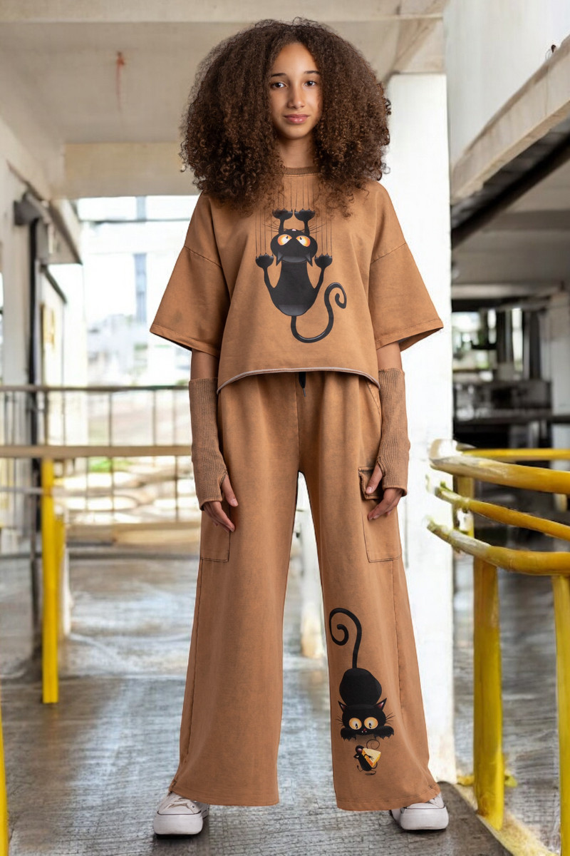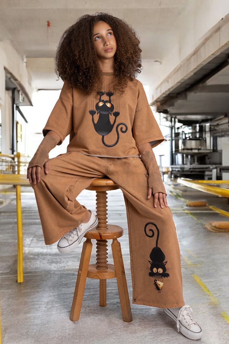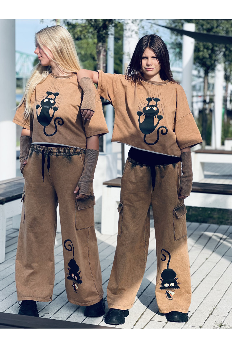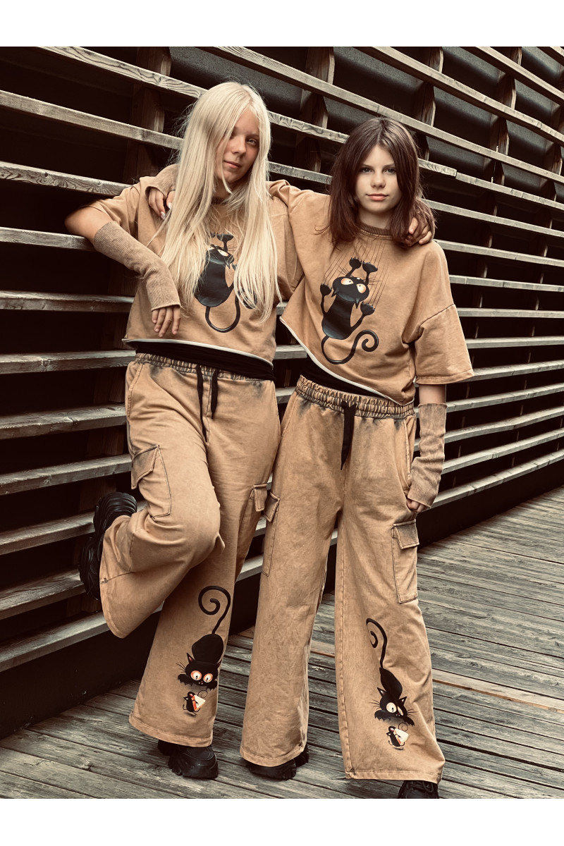 3-częściowy komplet dziewczęcy “Cat and Mouse” w skład, którego wchodzi bluzka i spodnie w stylu oversize oraz mitenki-rękawy. Rozmiary od 128 do 164