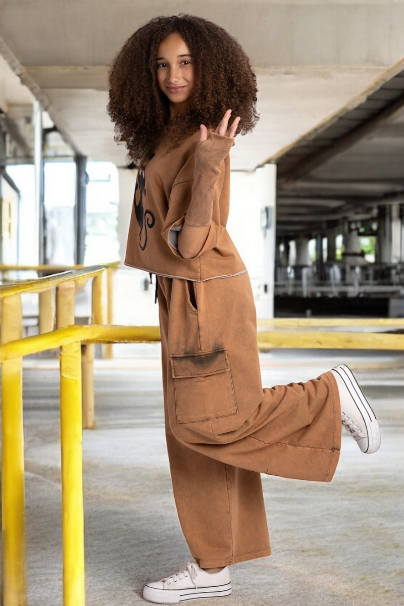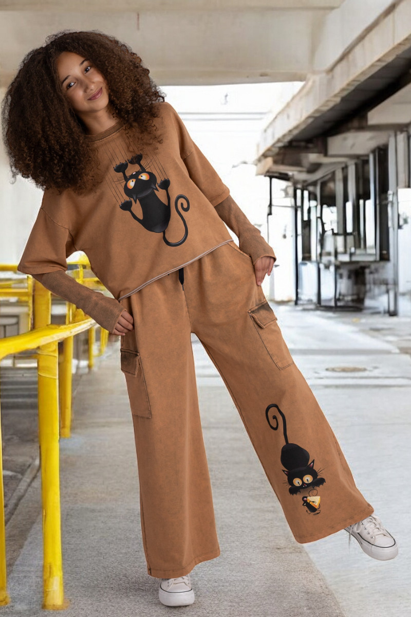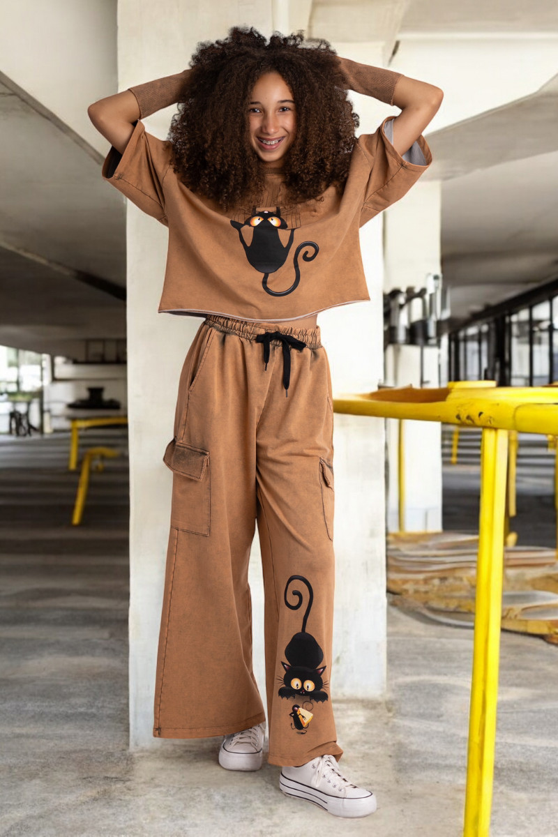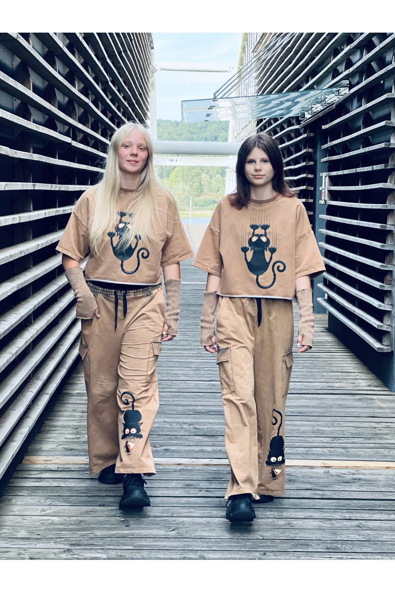 3-częściowy komplet dziewczęcy “Cat and Mouse” w skład, którego wchodzi bluzka i spodnie w stylu oversize oraz mitenki-rękawy. Rozmiary od 128 do 164