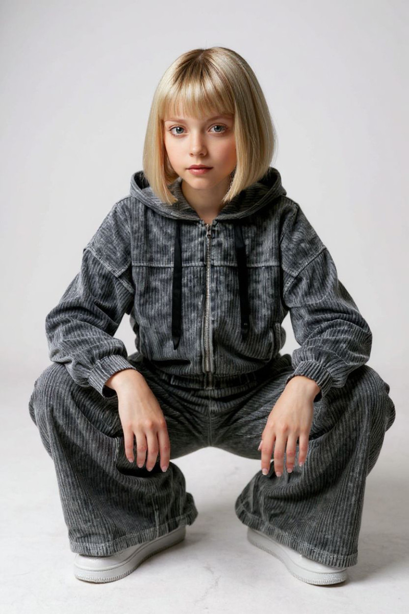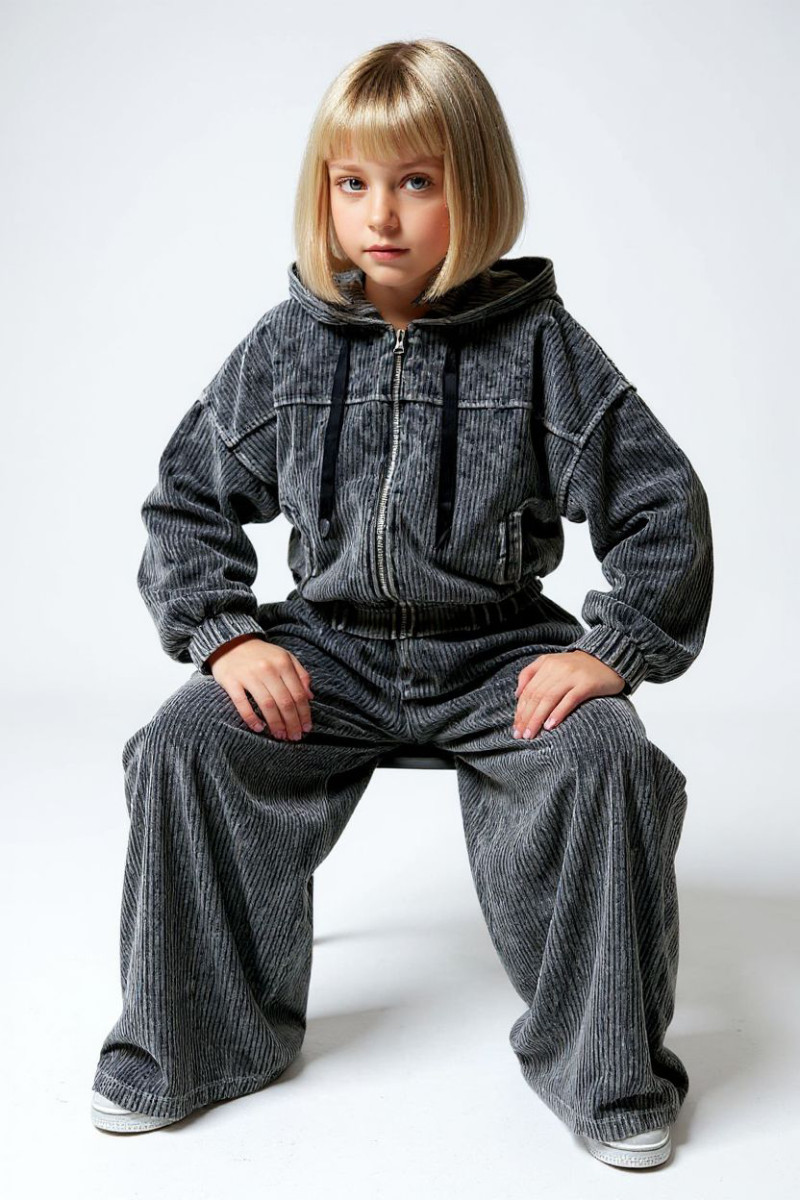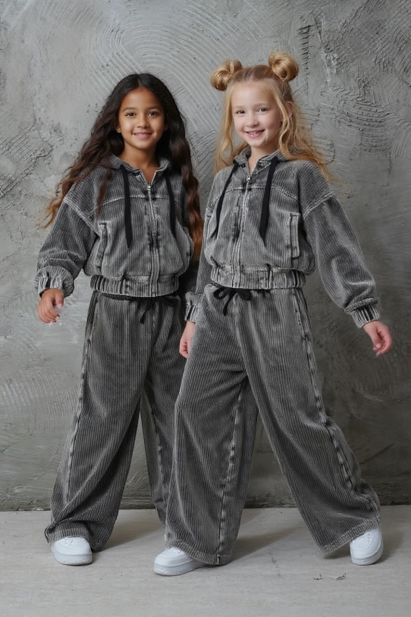 Stylowy, wygodny zestaw dla dziewczynek, które lubią swobodę ruchów i modny look. Wykonany z miękkiej, prążkowanej tkaniny o efekcie „washed” w odcieniu grafitowym.