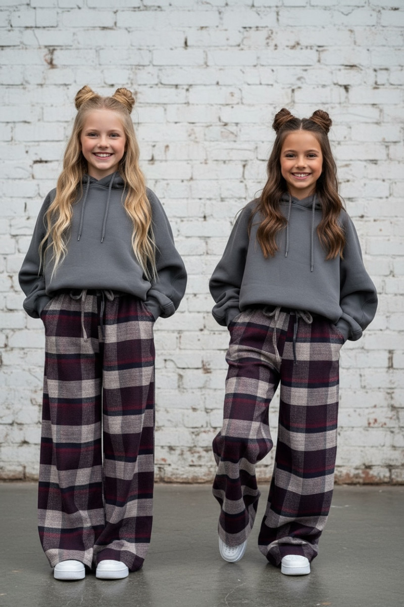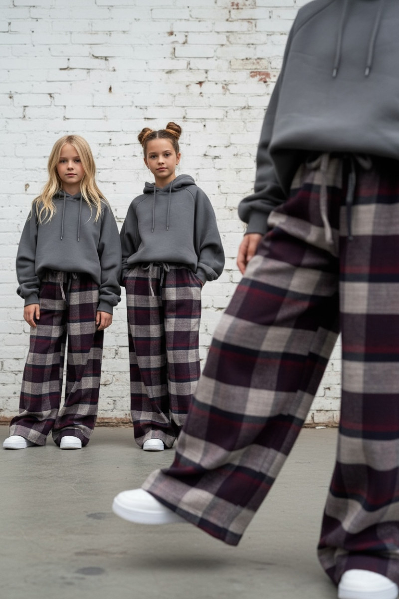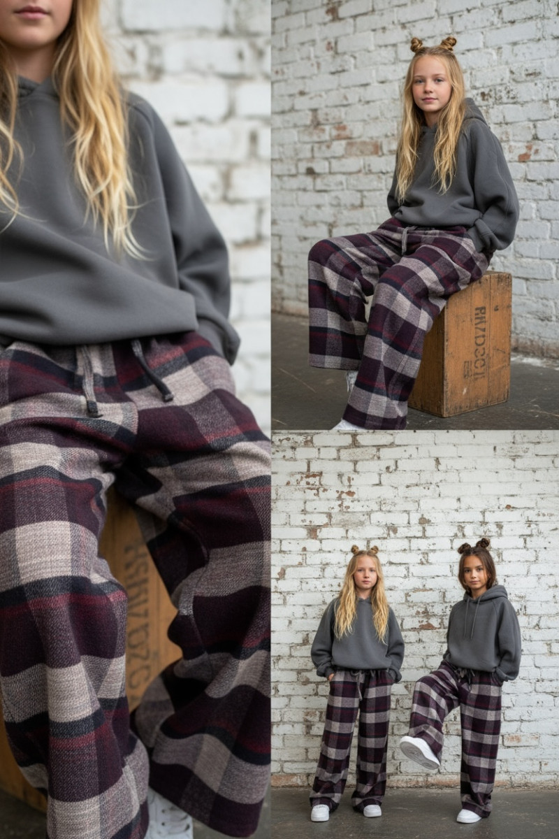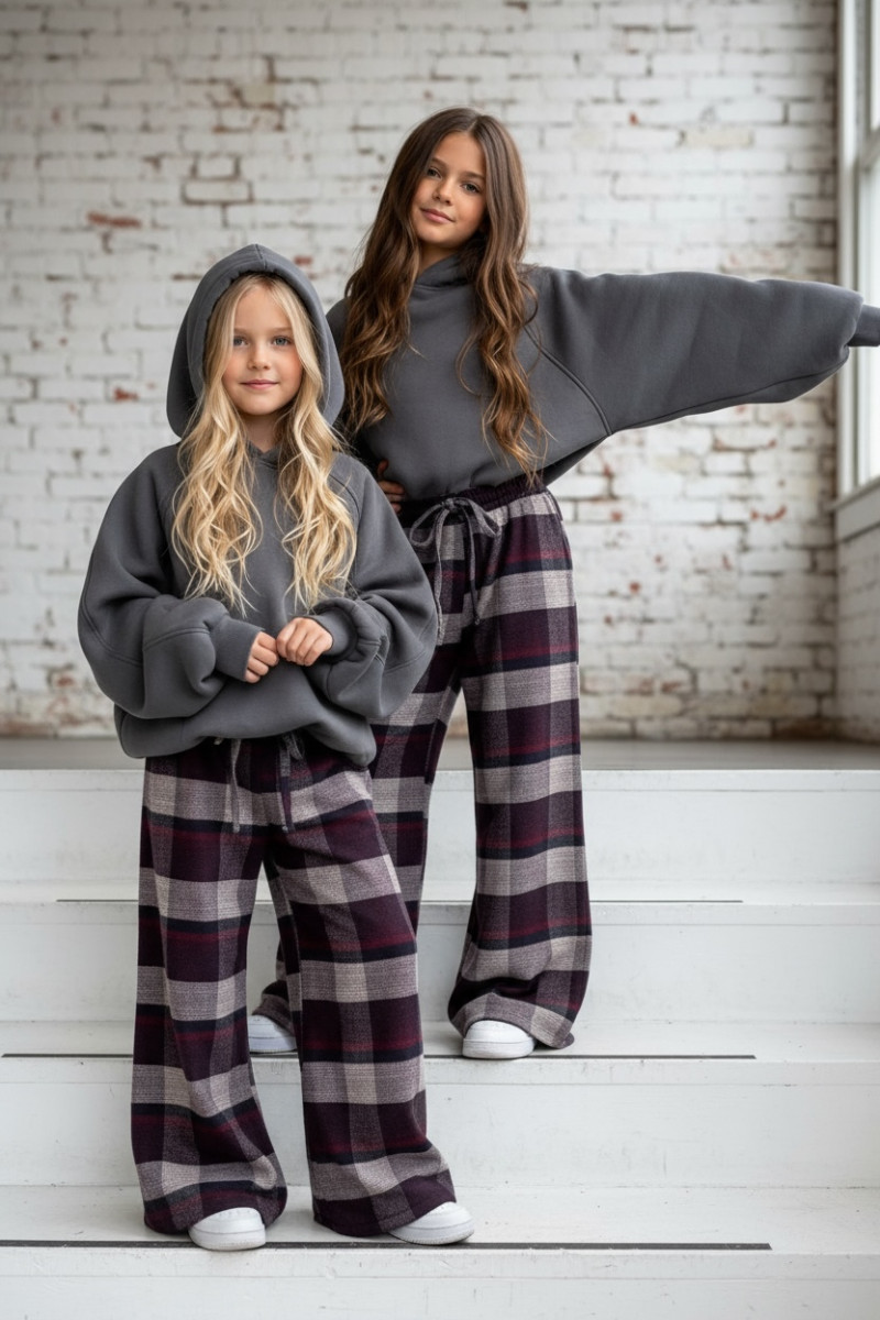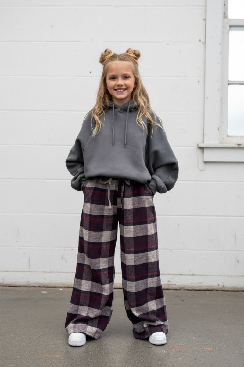 Dziewczęce spodnie z ciepłej, bawełnianej flaneli w kratę. Luźny, oversize’owy krój (model zawyżony) z prostą, szeroką nogawką i regulacją na dole – możesz ściągnąć nogawkę, aby dopasować długość. W pasie elastyczna guma i sznurek do regulacji. Miękkie, przytulne, idealne na chłodniejsze dni.