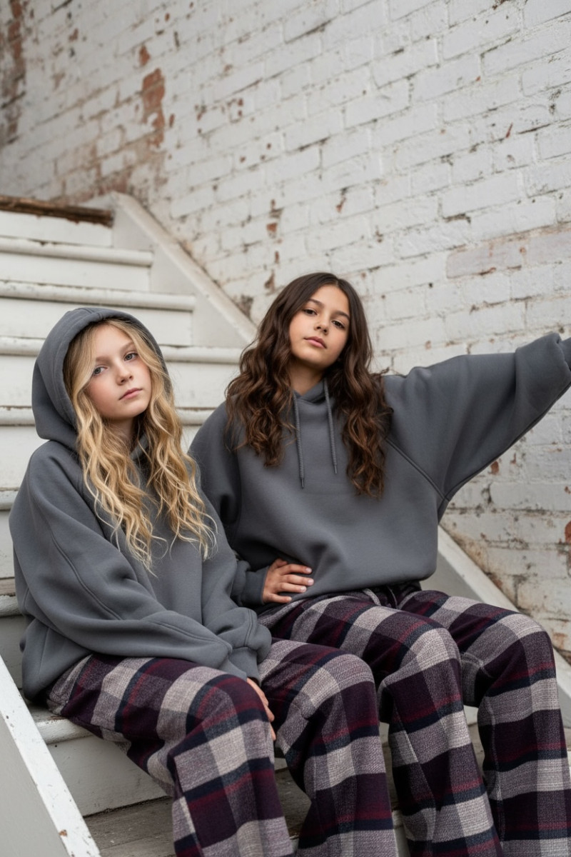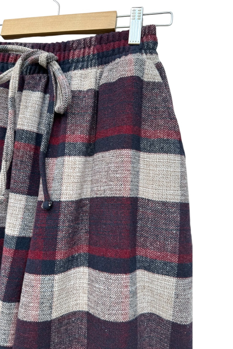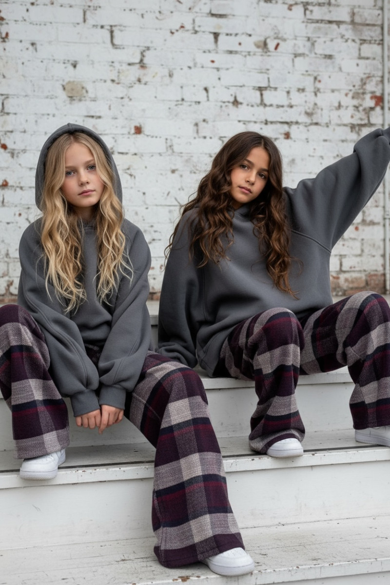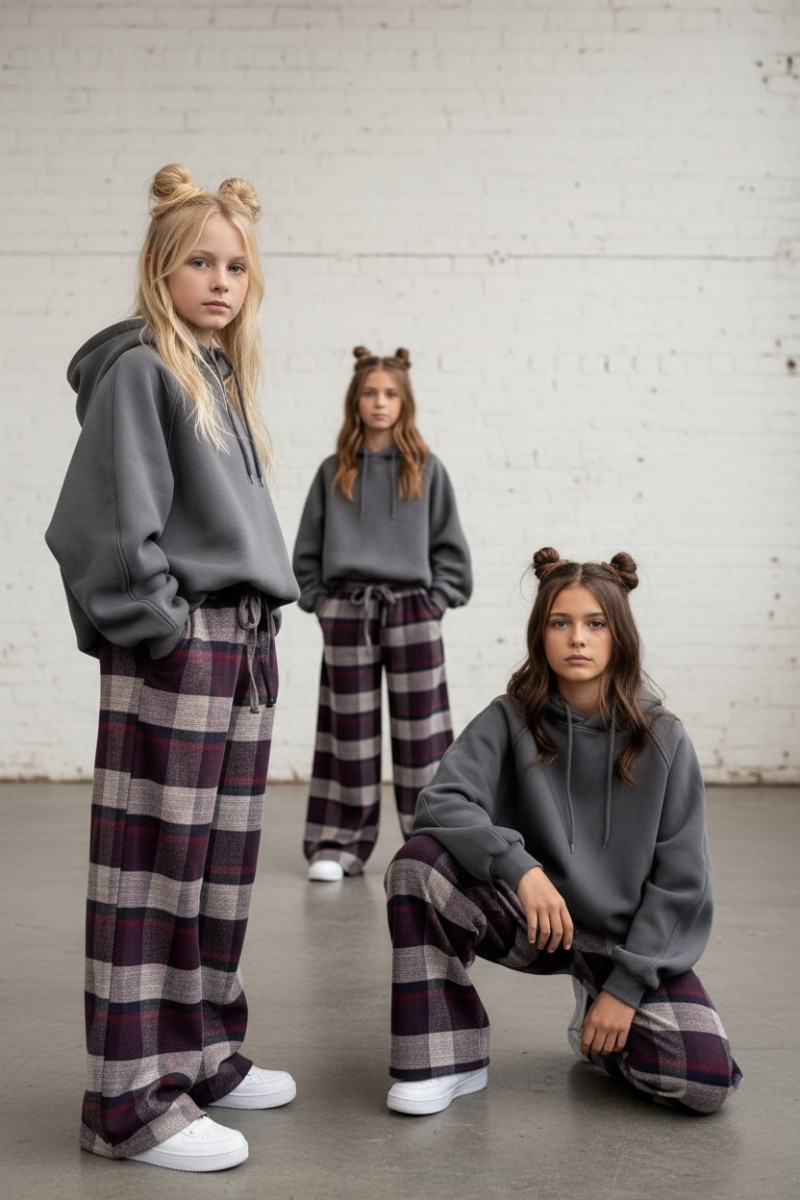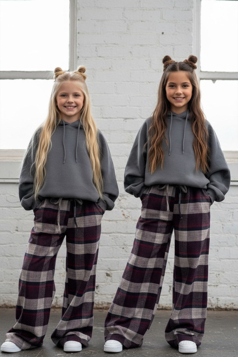Dziewczęce spodnie z ciepłej, bawełnianej flaneli w kratę. Luźny, oversize’owy krój (model zawyżony) z prostą, szeroką nogawką i regulacją na dole – możesz ściągnąć nogawkę, aby dopasować długość. W pasie elastyczna guma i sznurek do regulacji. Miękkie, przytulne, idealne na chłodniejsze dni.