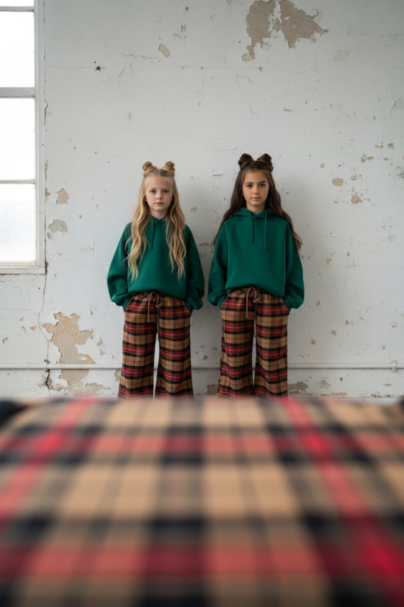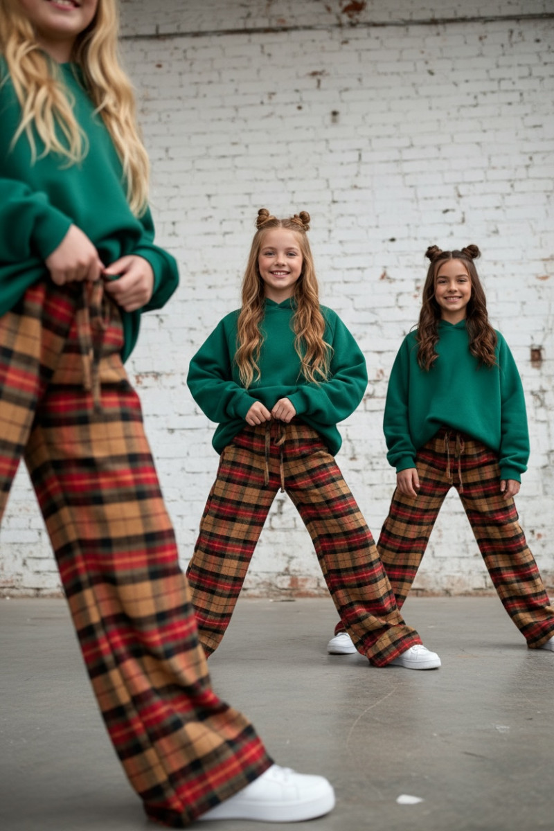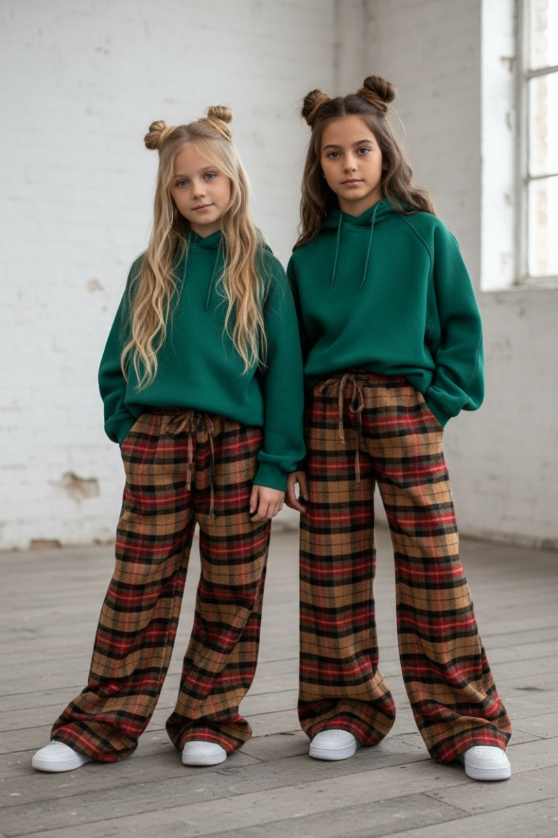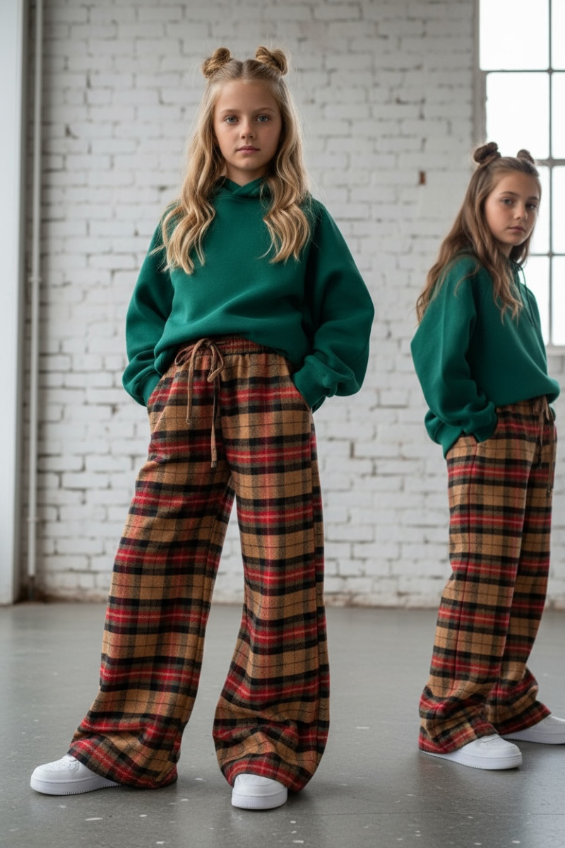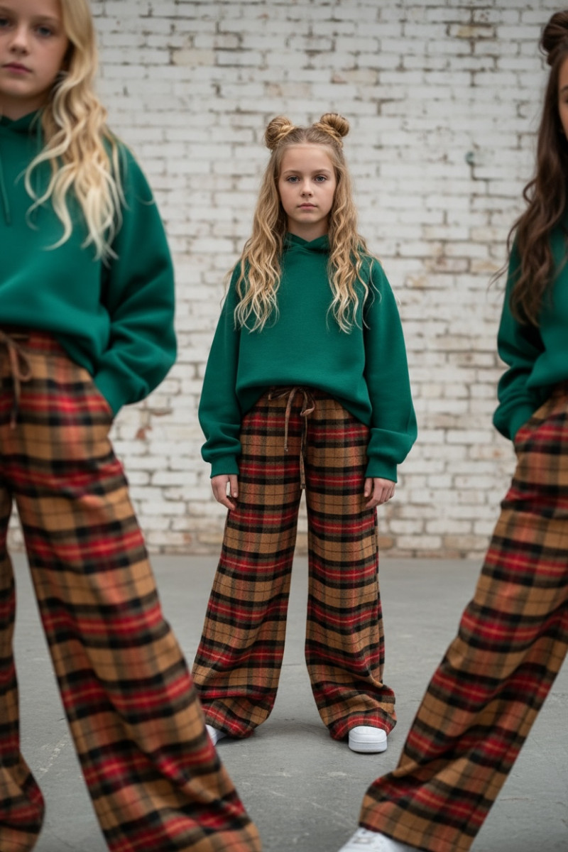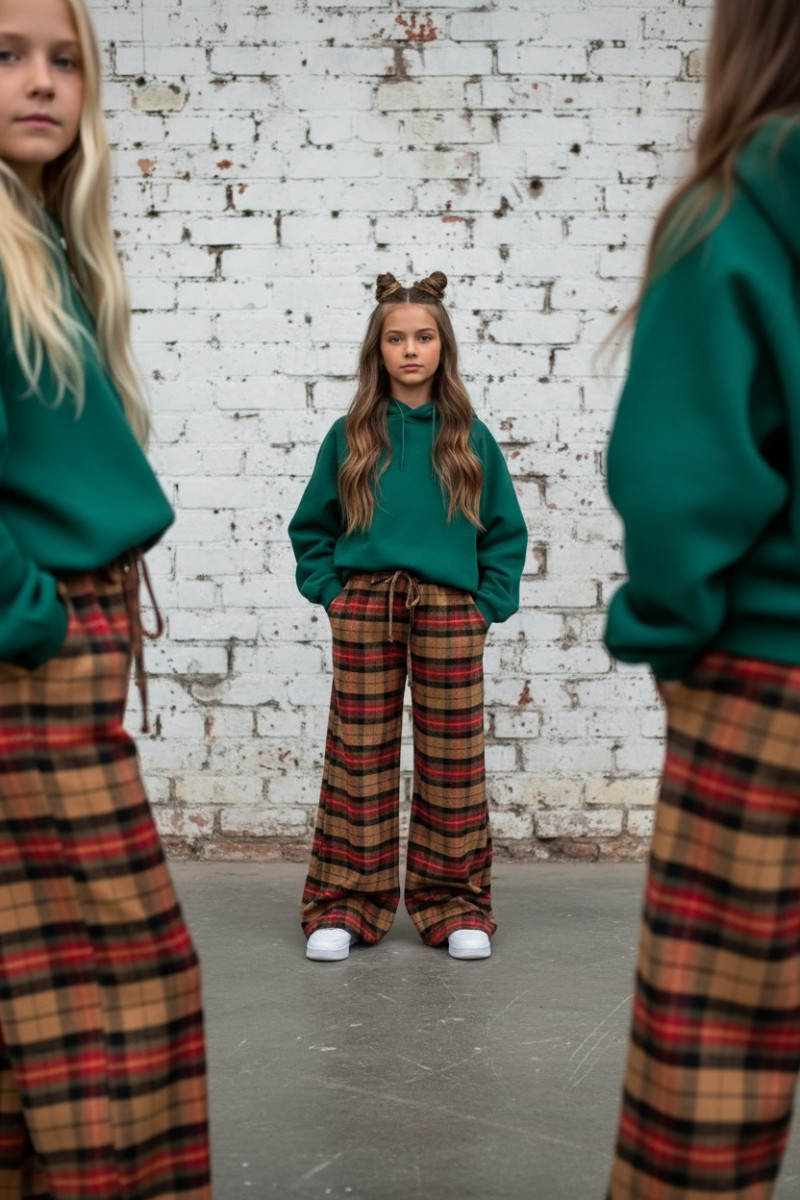 Dziewczęce spodnie z ciepłej, bawełnianej flaneli w kratę. Luźny, oversize’owy krój (model zawyżony) z prostą, szeroką nogawką i regulacją na dole – możesz ściągnąć nogawkę, aby dopasować długość. W pasie elastyczna guma i sznurek do regulacji. Miękkie, przytulne, idealne na chłodniejsze dni.
