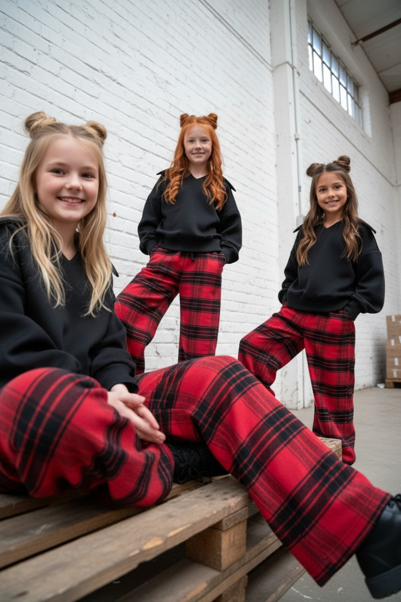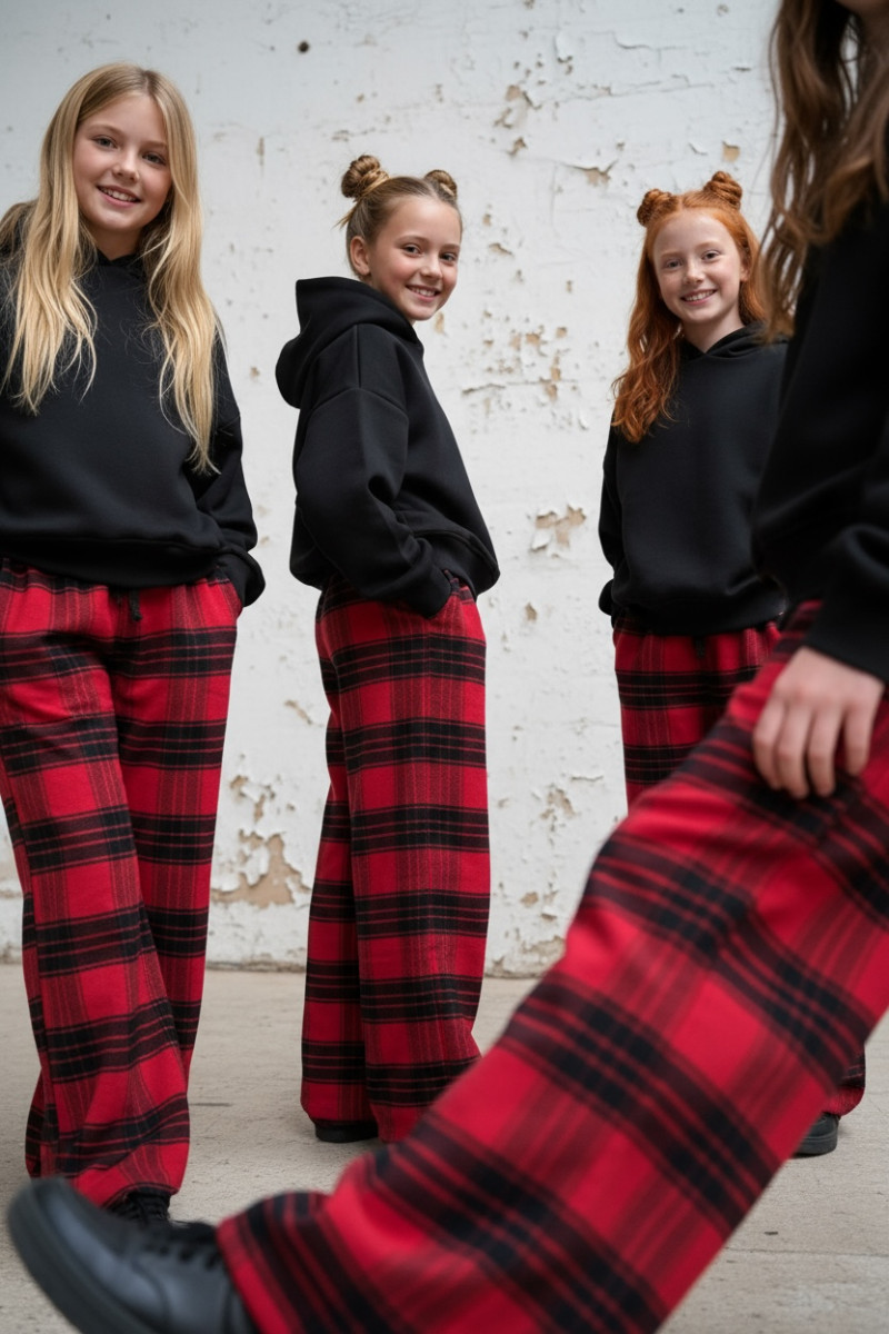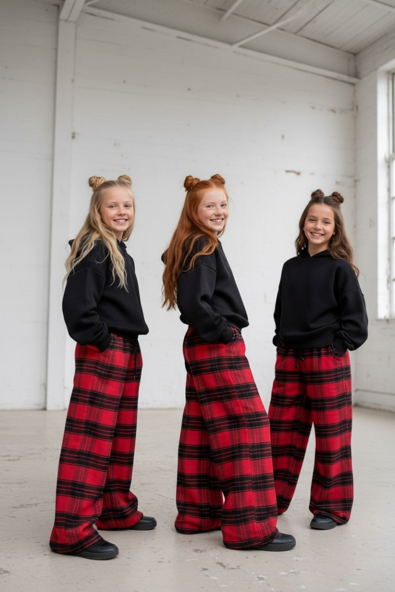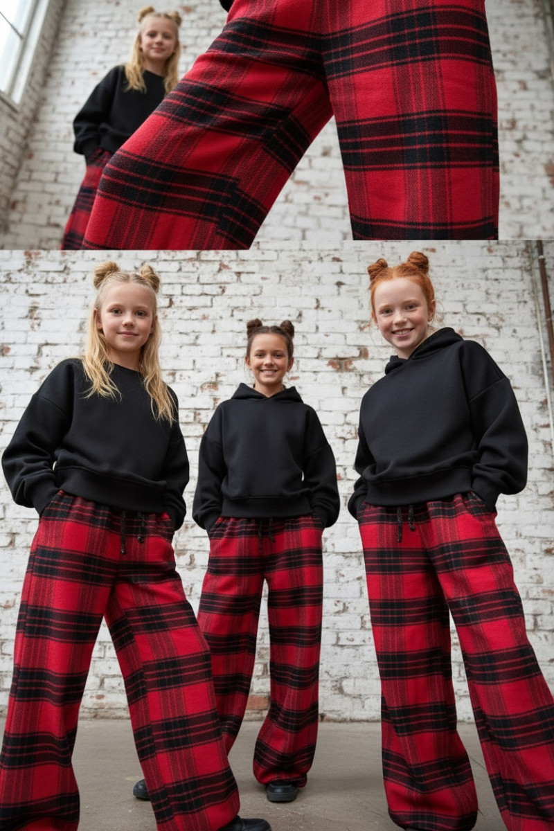 Dziewczęce spodnie z ciepłej, bawełnianej flaneli w kratę. Luźny, oversize’owy krój (model zawyżony) z prostą, szeroką nogawką i regulacją na dole – możesz ściągnąć nogawkę, aby dopasować długość. W pasie elastyczna guma i sznurek do regulacji. Miękkie, przytulne, idealne na chłodniejsze dni.