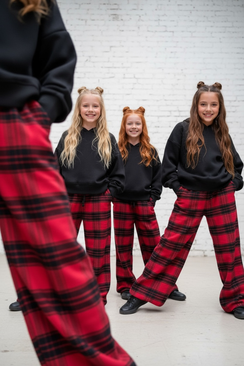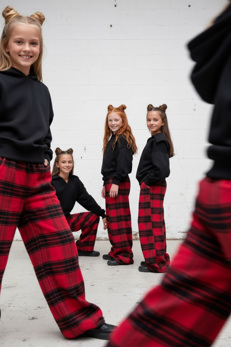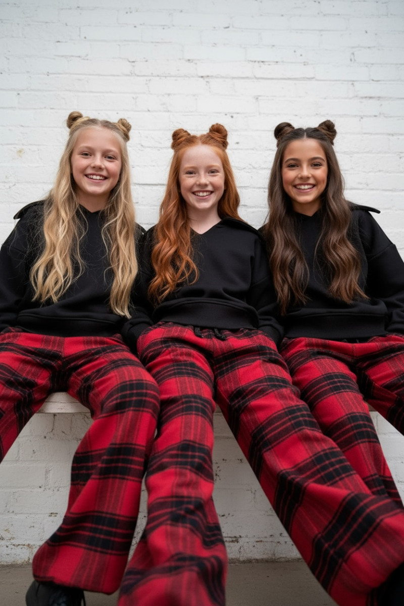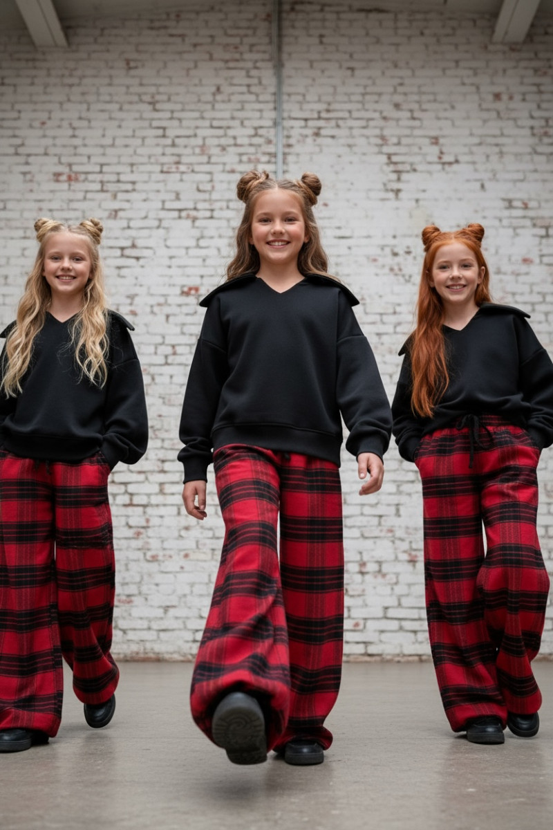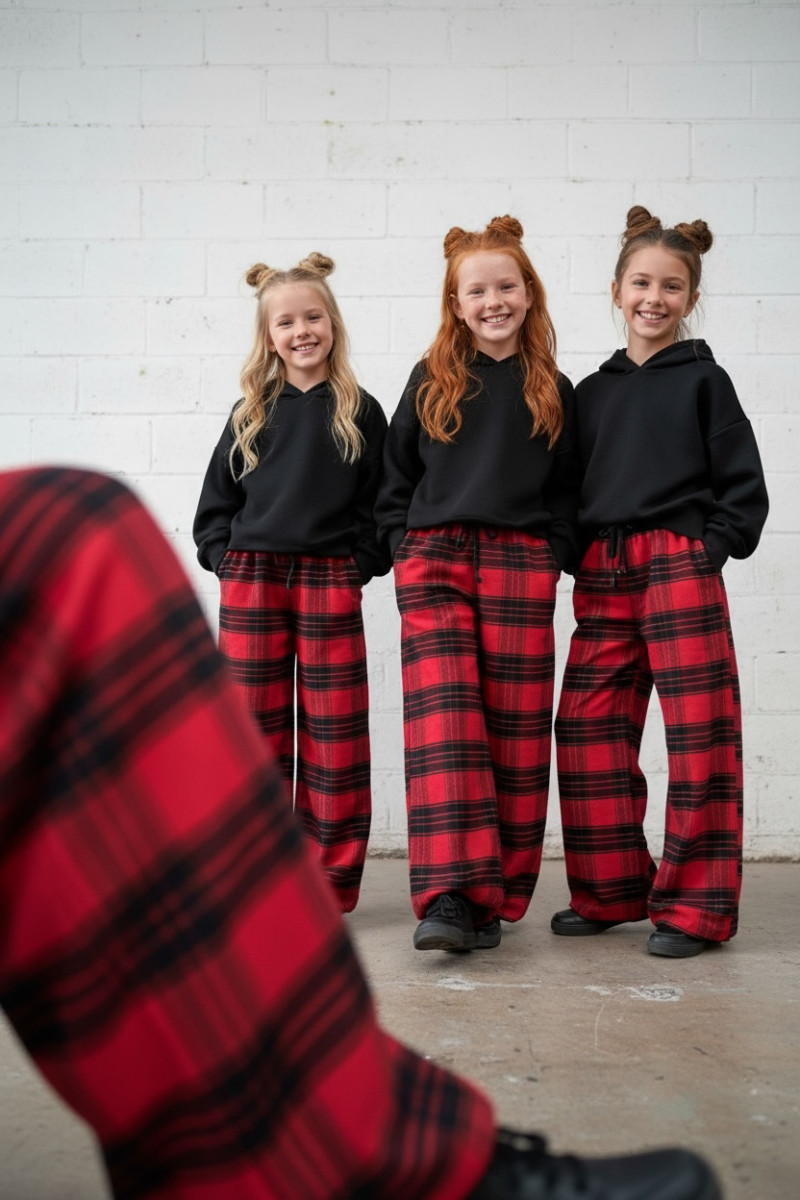 Dziewczęce spodnie z ciepłej, bawełnianej flaneli w kratę. Luźny, oversize’owy krój (model zawyżony) z prostą, szeroką nogawką i regulacją na dole – możesz ściągnąć nogawkę, aby dopasować długość. W pasie elastyczna guma i sznurek do regulacji. Miękkie, przytulne, idealne na chłodniejsze dni.
