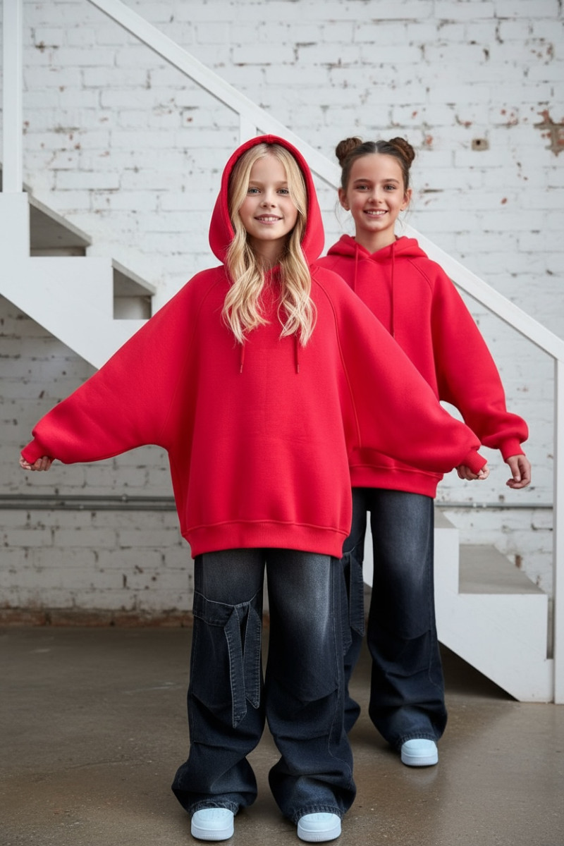 Przedstawiamy wyjątkową bluzę dziecięcą z kapturem, idealną na chłodniejsze dni. Bluza w kolorze granatu, wykonana z wysokiej jakości bawełny drapanej zapewnia komfort noszenia oraz ciepło. Bluza o modnym kroju "nietoperza", luzny i wygodny fason, z pogrubionymi lamówkami  co nadaje jej unikalny i modny wygląd.