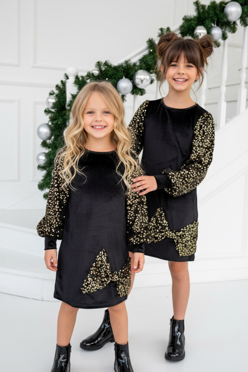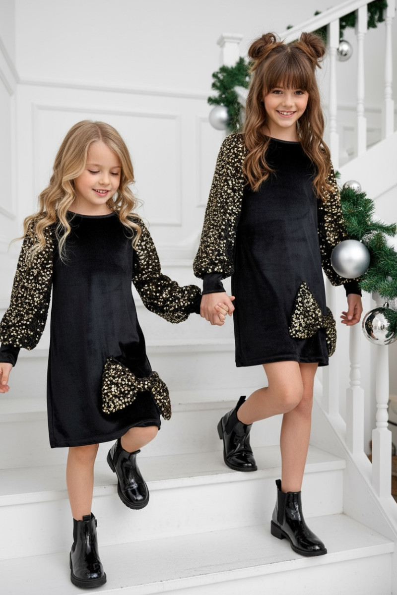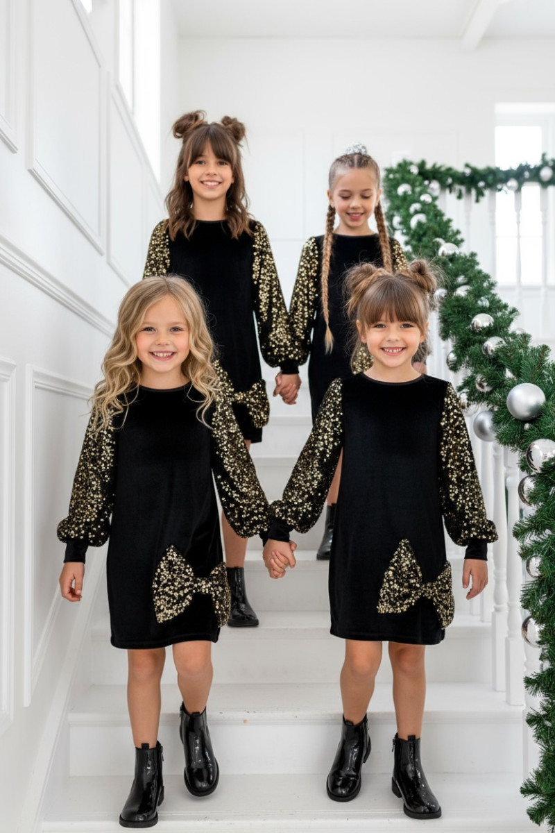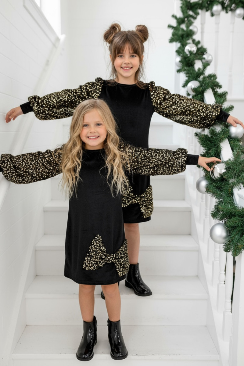 Wyjątkowa sukienka welurowa z cekinami -projektu Sówki & OliLeo. Sukienka łączy miękki elegancki welur z bajecznie błyszczącymi cekinami idealna na święta urodziny bale i wszystkie ważne chwile. Bufiaste rękawy z cekinów i ozdobna kokarda, cekiny nie gryzą są starannie obszyte co zapewnia dziecku maksymalny komfort.