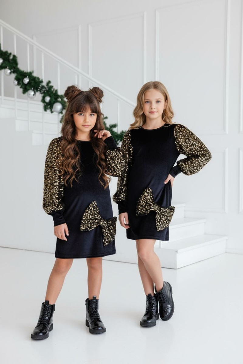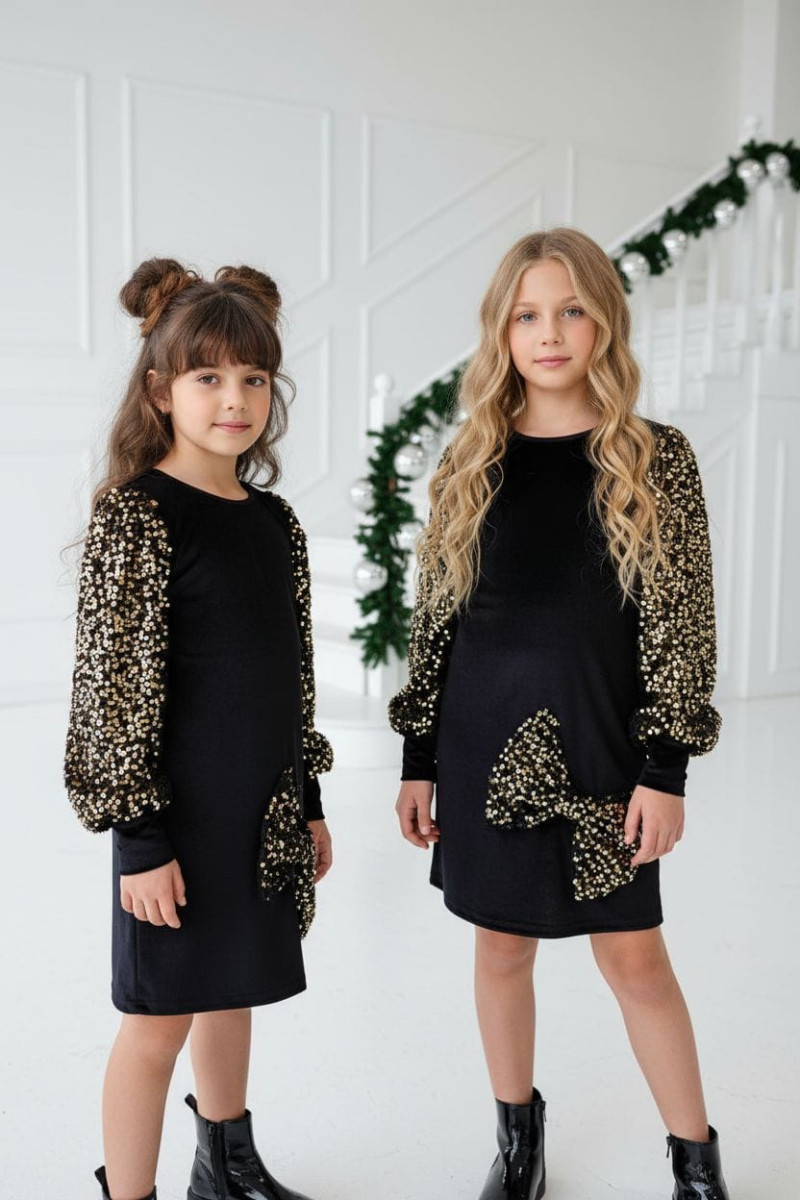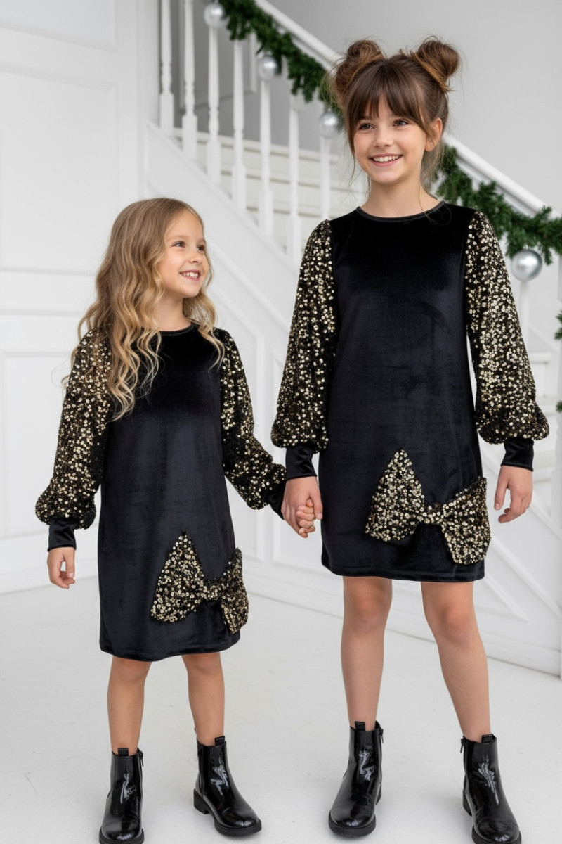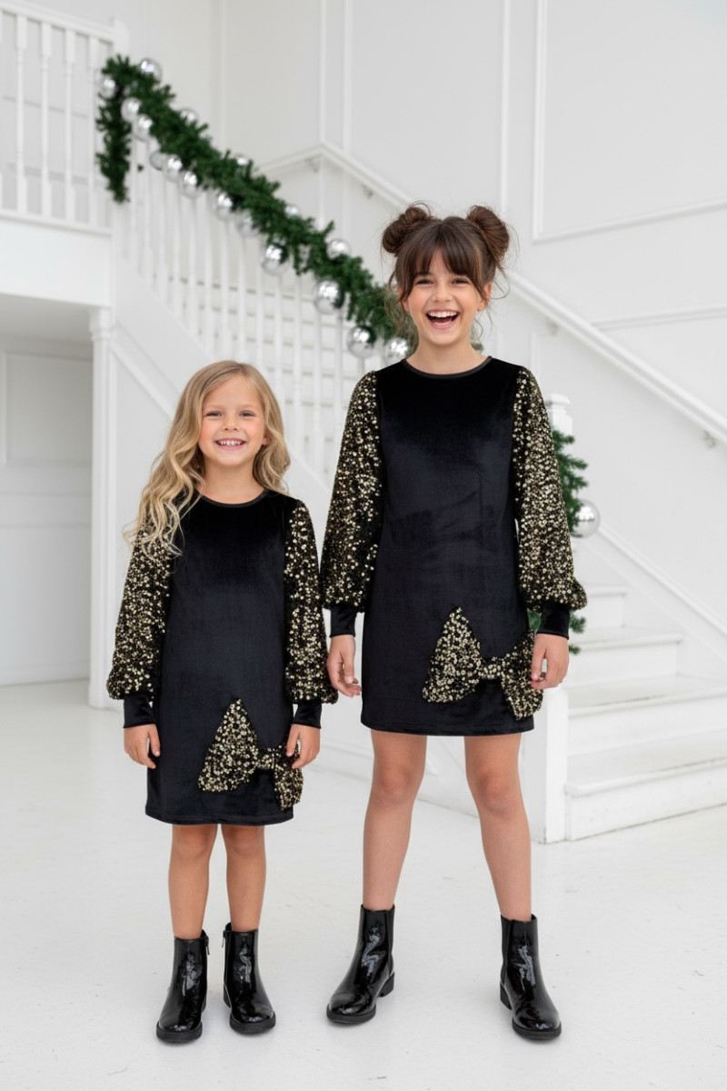 Wyjątkowa sukienka welurowa z cekinami -projektu Sówki & OliLeo. Sukienka łączy miękki elegancki welur z bajecznie błyszczącymi cekinami idealna na święta urodziny bale i wszystkie ważne chwile. Bufiaste rękawy z cekinów i ozdobna kokarda, cekiny nie gryzą są starannie obszyte co zapewnia dziecku maksymalny komfort.
