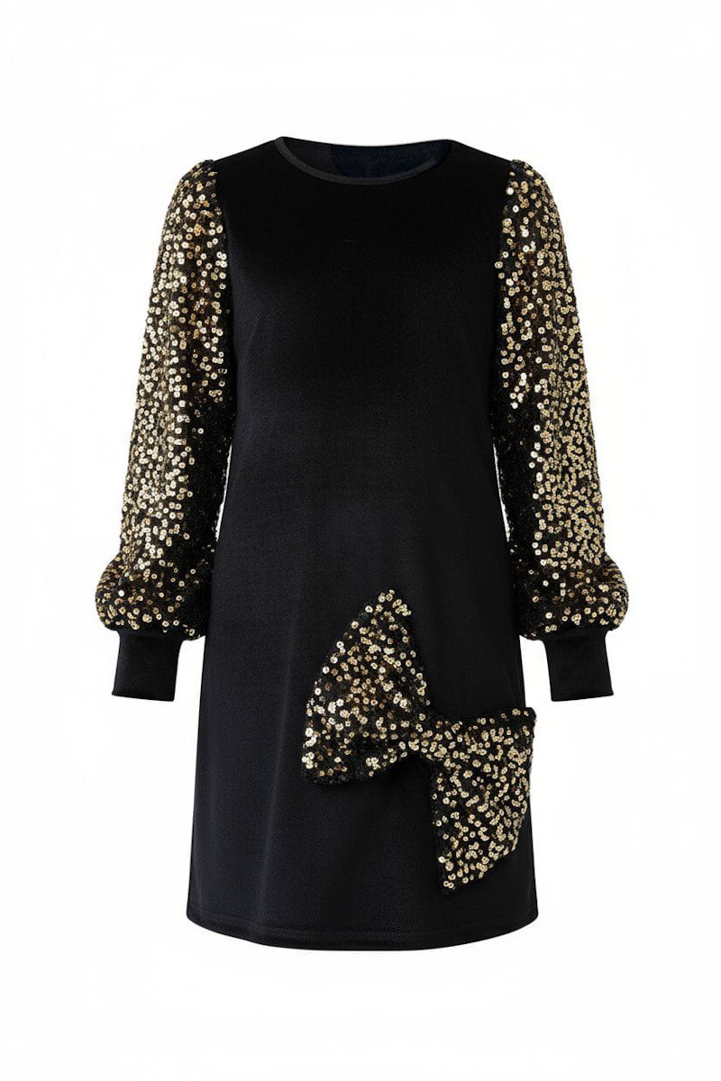 • Subtelne cekiny na rękawach i kokardach, które pięknie mienią się w świetle, dodając blasku bez przesady.