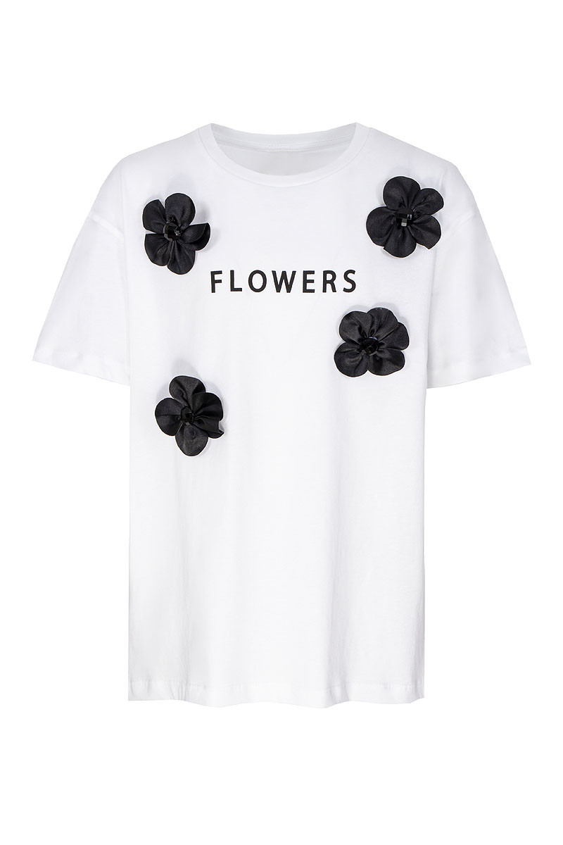 Piękna i unikatowa biała bluzka dla dziewczynki na krótki rękaw wykonana ze świetnej jakości bawełny. Przewiewna i miła dla ciała dziecka. T-shirt w kolorze białym ma bardzo modny krój, posiada ozdobny napis FLOWERS oraz kilka czarnych kwiatków doczepionych do materiału, które dodatkowo powodują, że bluzka zyskuje dodatkowe ciekawe elementy.