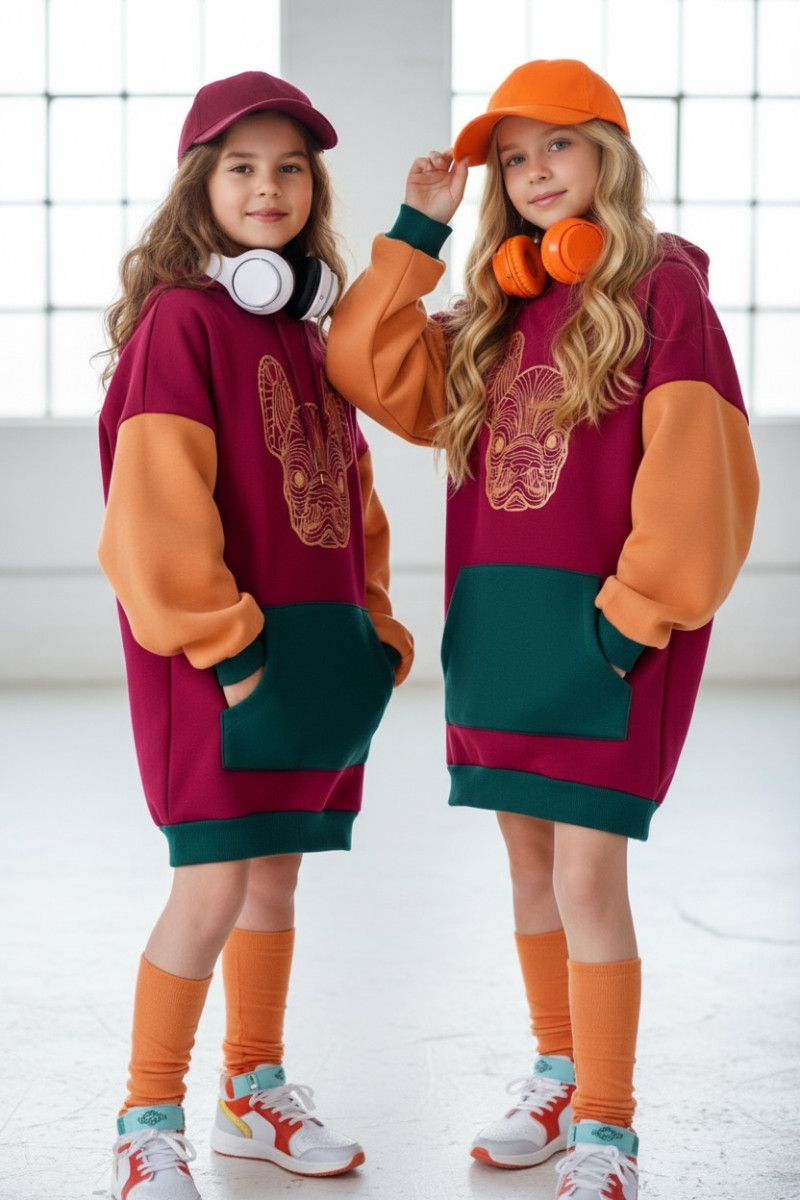 Wyjątkowy zestaw, który idealnie łączy komfort i styl! Długa bluza w soczystych kolorach bordowym, pomarańczowym i zielonym, jest nie tylko ciepła, ale również niezwykle modna. Grafika przedstawiająca psa doda odrobinę uroku każdemu dniu. Bluza posiada praktyczne kieszenie oraz wygodny kaptur chroniący przed chłodem.