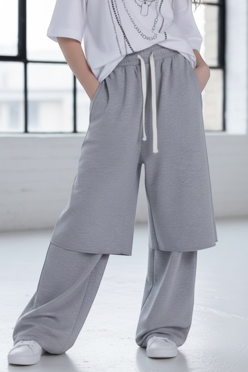 Szare spodnie dresowe wide-leg z warstwowym panelem (140–164). Rozmiar 164 to odpowiednik rozmiaru 170