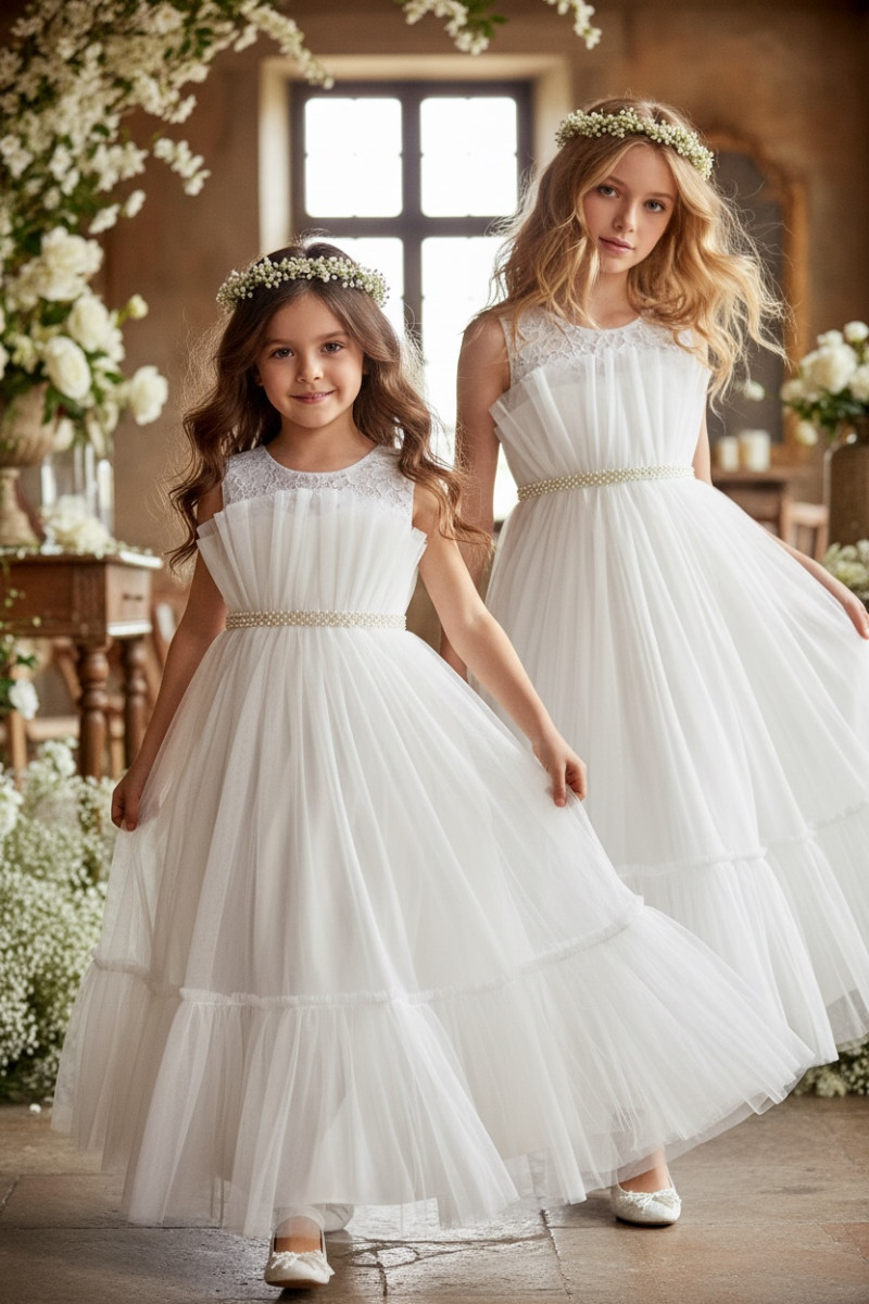 Zjawiskowa sukienka dla dziewczynki w jakości super premium. Jakość wykonania bardzo wysoka, bardzo bogato zdobiona, góra sukienki jest wykonana z koronki, z kolei talia i dół sukienki to tiul podszyty podszewkami.